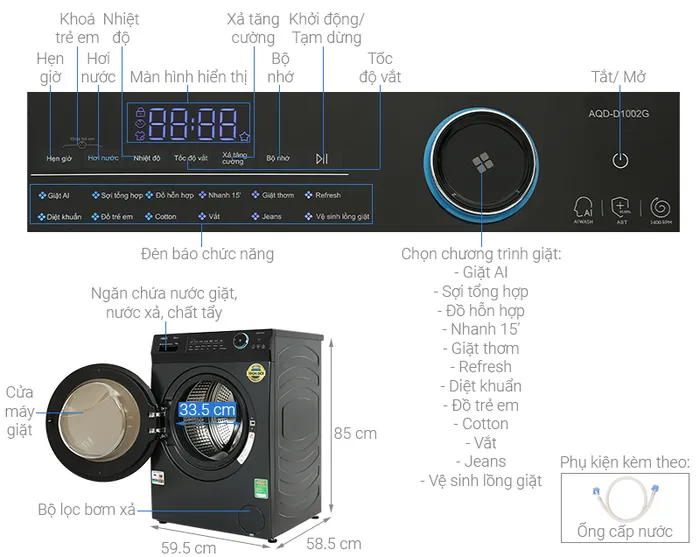 Đồ trẻ em, Sợi tổng hợp, Refresh, Giặt AI, Đồ Jeans, Đồ hỗn hợp, Đồ cotton, Vệ sinh lồng giặt, Vắt, Giặt thơm, Giặt nhanh 15 phút, Diệt khuẩn |
